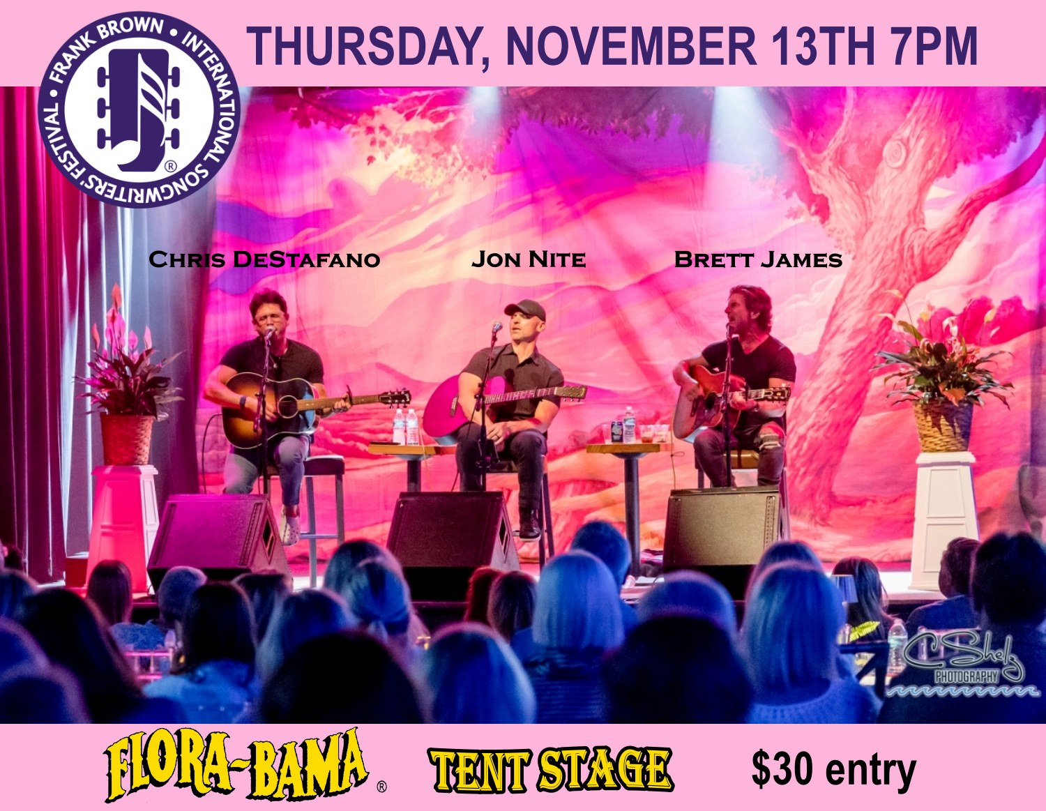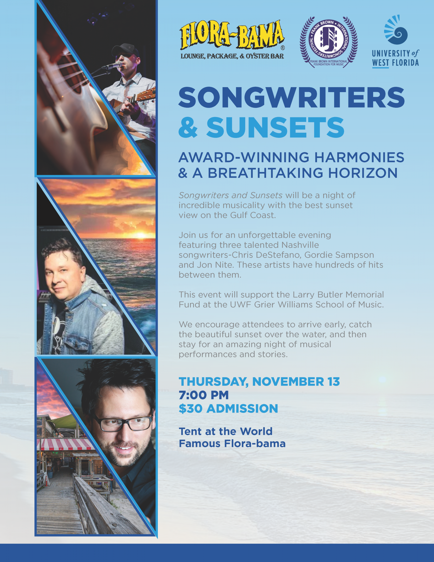 Join us for evening of incredible music on Flora-Bama's Tent Stage featuring three talented Nashville songwriters- Chris DeStefano, Brett James and Jon Nite. These artists have recorded 60 number one top country hits and have earned countless awards for their work including several Grammy's. This is an evening of music you don't want to miss. Proceeds will go to the Larry Butler Memorial Music Fund at the University of West Florida. For all things Flora-Bama Click Here